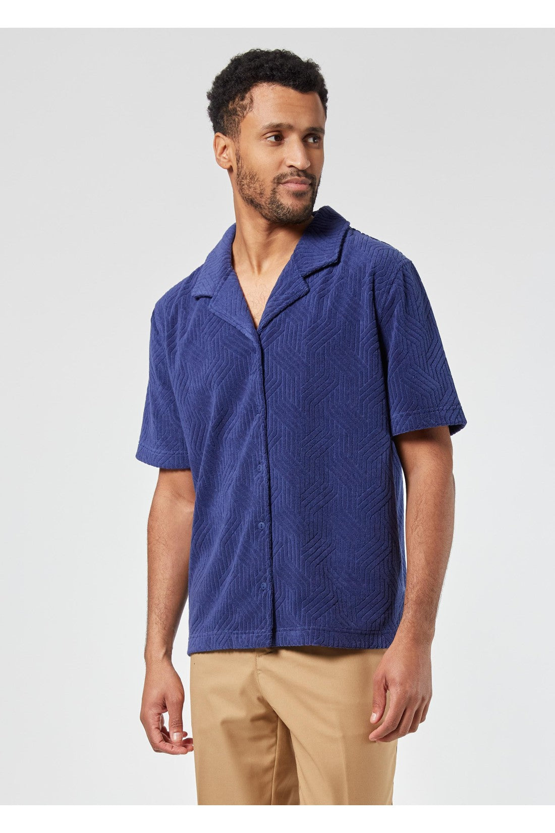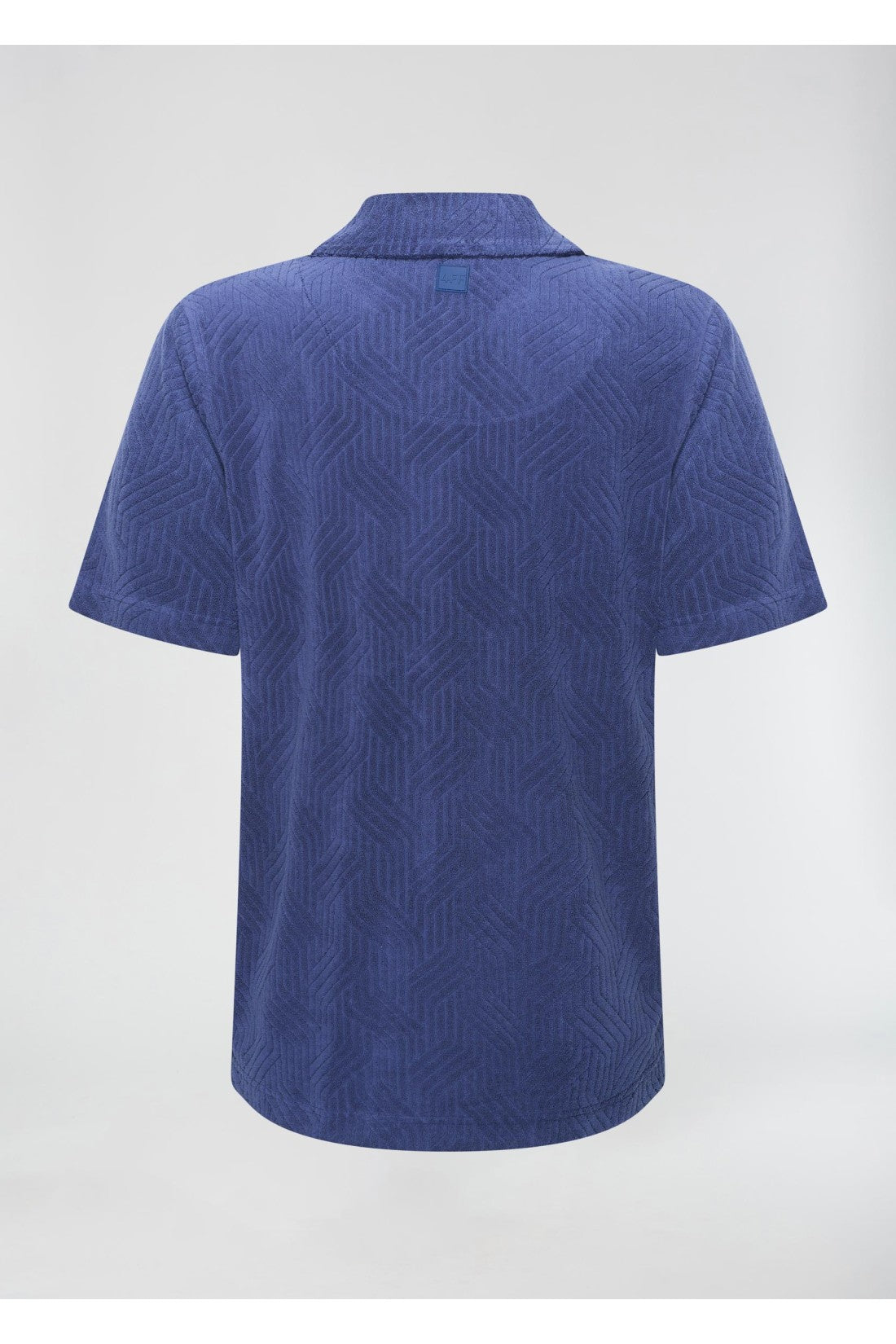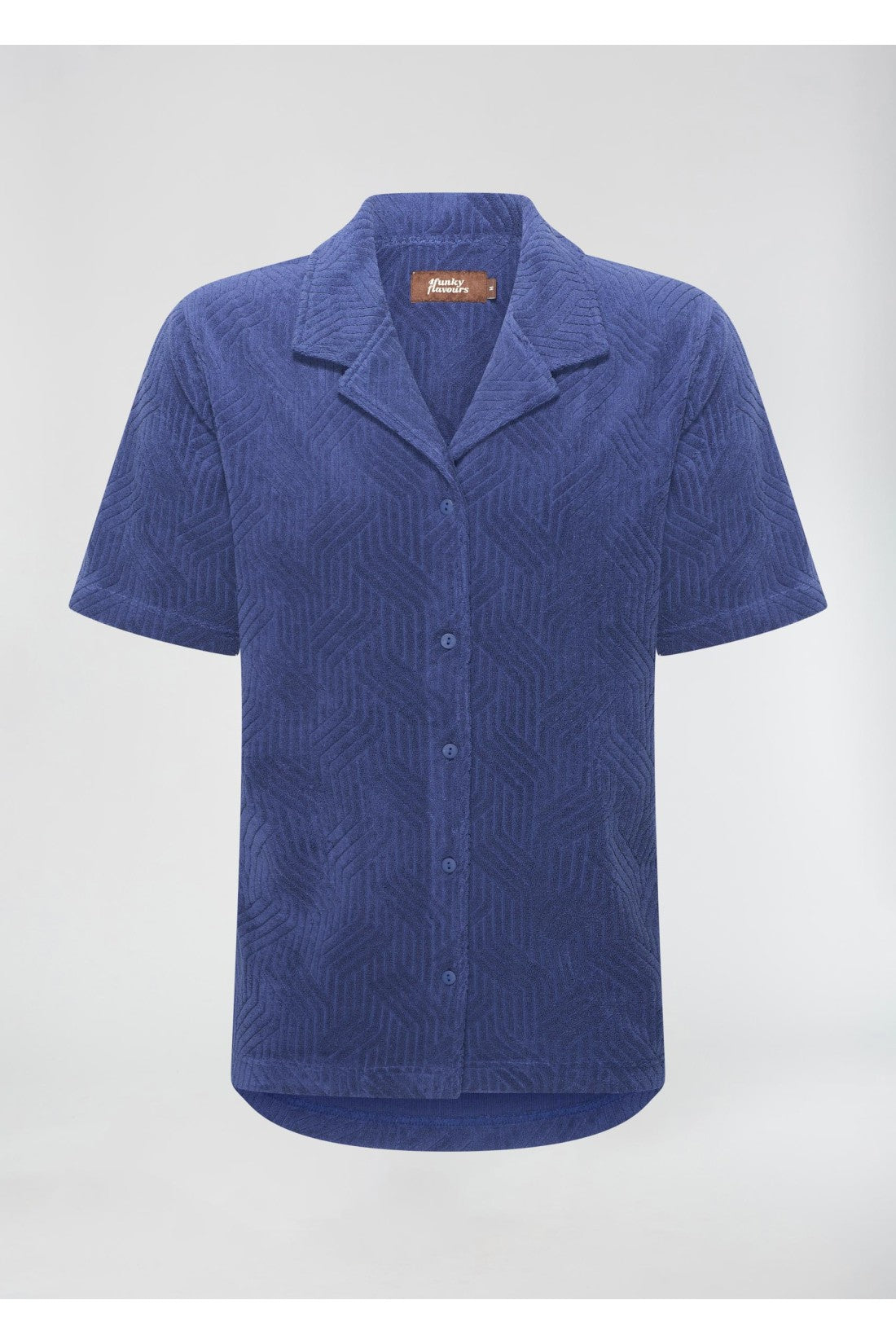 Camisa de felpa con cuello revere, mangas cortas con patrón gráfico y cierre de botones. Color: Azul