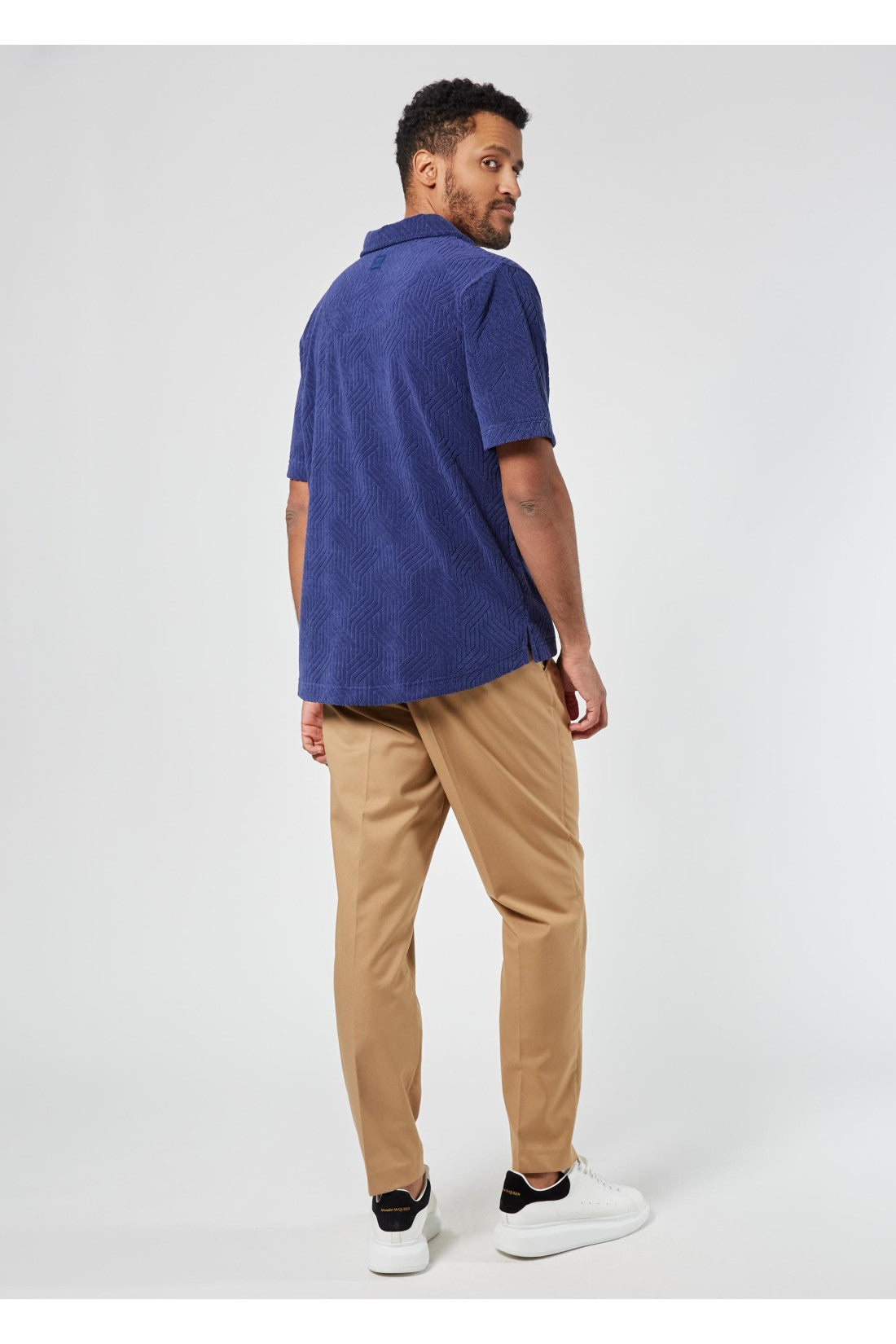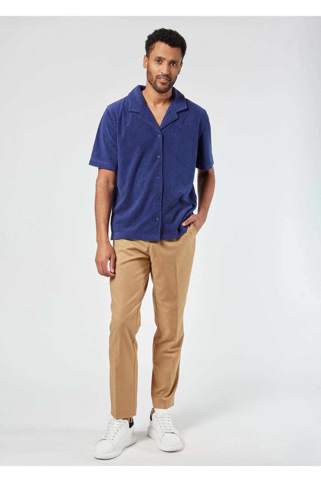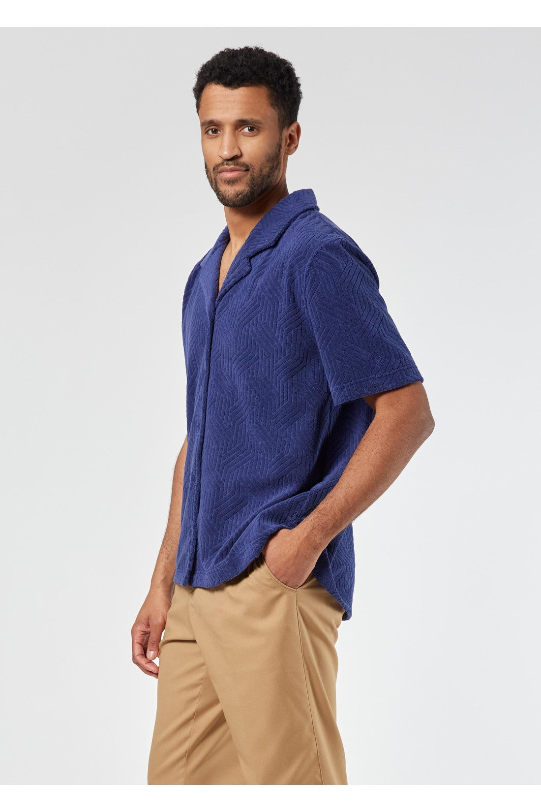 Camisa de felpa con cuello revere, mangas cortas con patrón gráfico y cierre de botones. Color: Azul