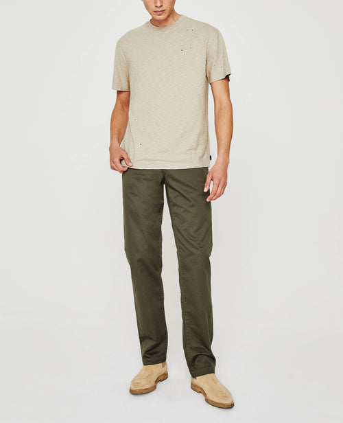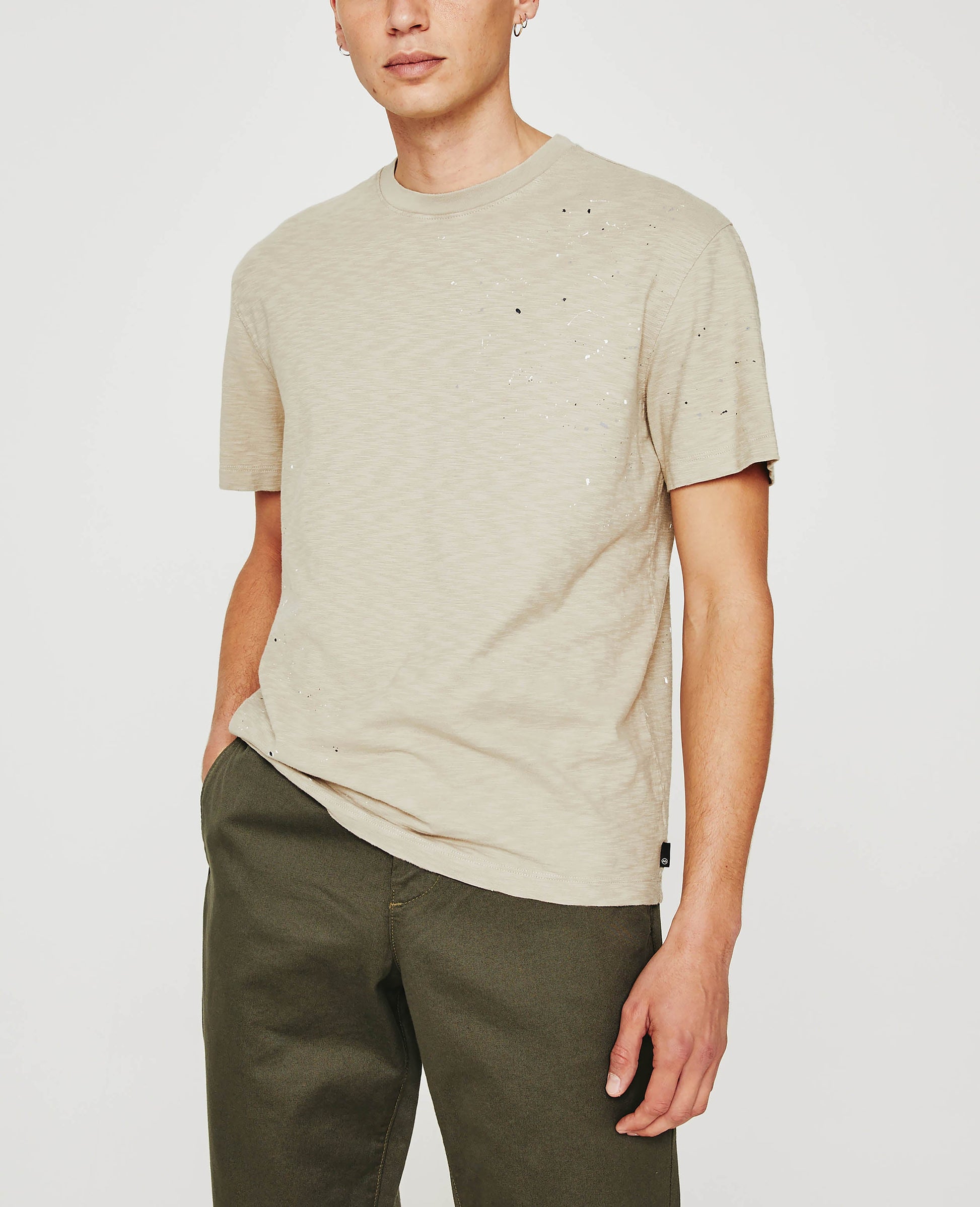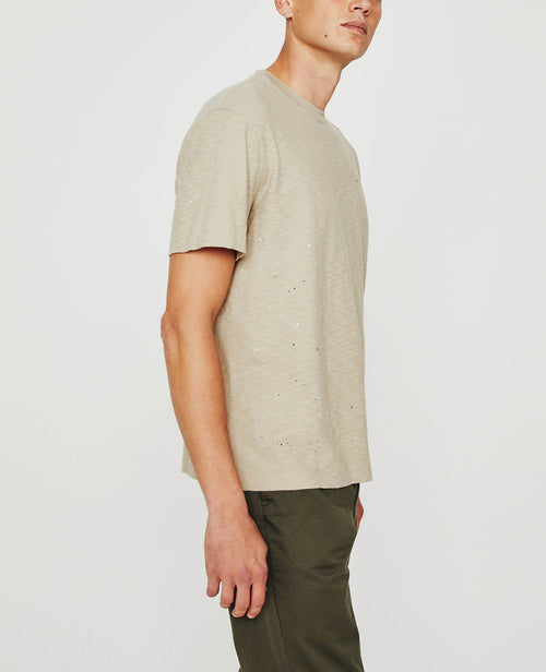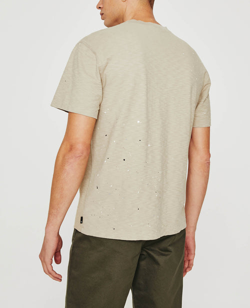 La Wesley Crew es una camiseta relajada de cuello redondo en beige lavado con un acabado moteado de pintura y bordes desgastados. Suave y ligera en jersey Luxe Slub 100% algodón, esta camiseta de manga corta presenta detalles de hombros caídos y un dobladillo más ancho para un ajuste más moderno.
