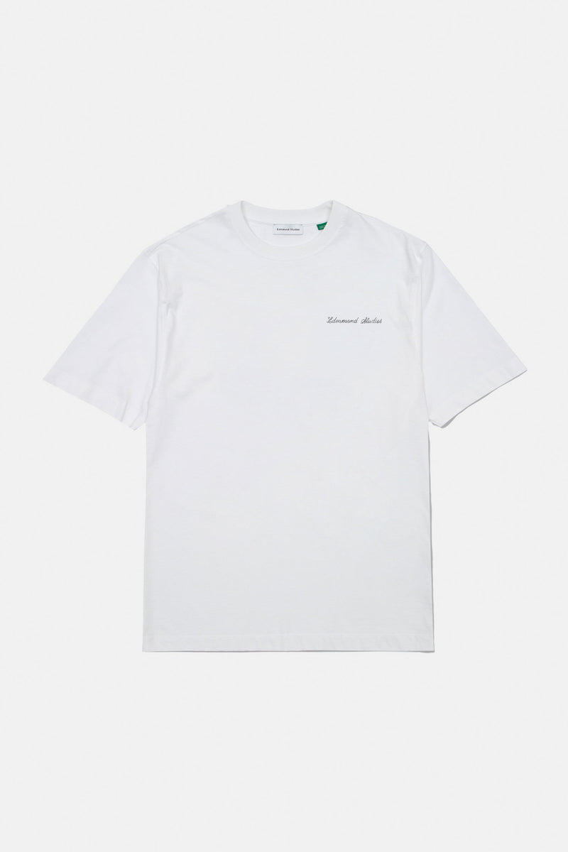 Camiseta blanca de manga corta en tejido open end con print a pantalla en la espalda y logo en la parte delantera izquierda. Confeccionada en algodón orgánico 100%. Fabricada en Portugal