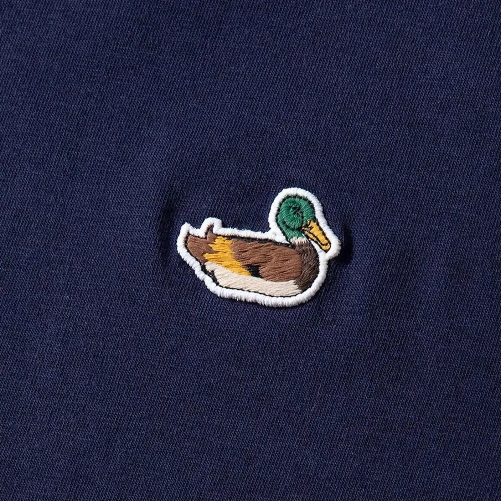 Camiseta de cuello redondo regular fit de color azul marino, confeccionada en algodón 100% orgánico, conocido por su transpirabilidad y durabilidad. Adornada con un pato bordado. Fabricada en Portugal.