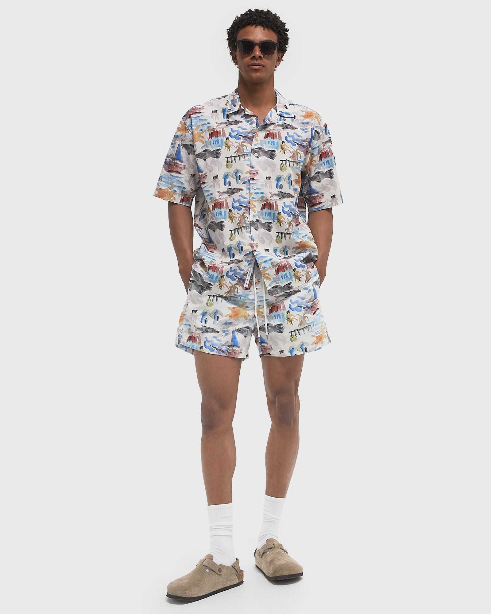 El pantalón HOLIDAYS SHORTS de Edmmond Studios con estampado de pinceladas de acuarela está confeccionado en un tejido ligero. Una cintura elástica con cordón ajustable y dos bolsillos laterales garantizan comodidad y funcionalidad.