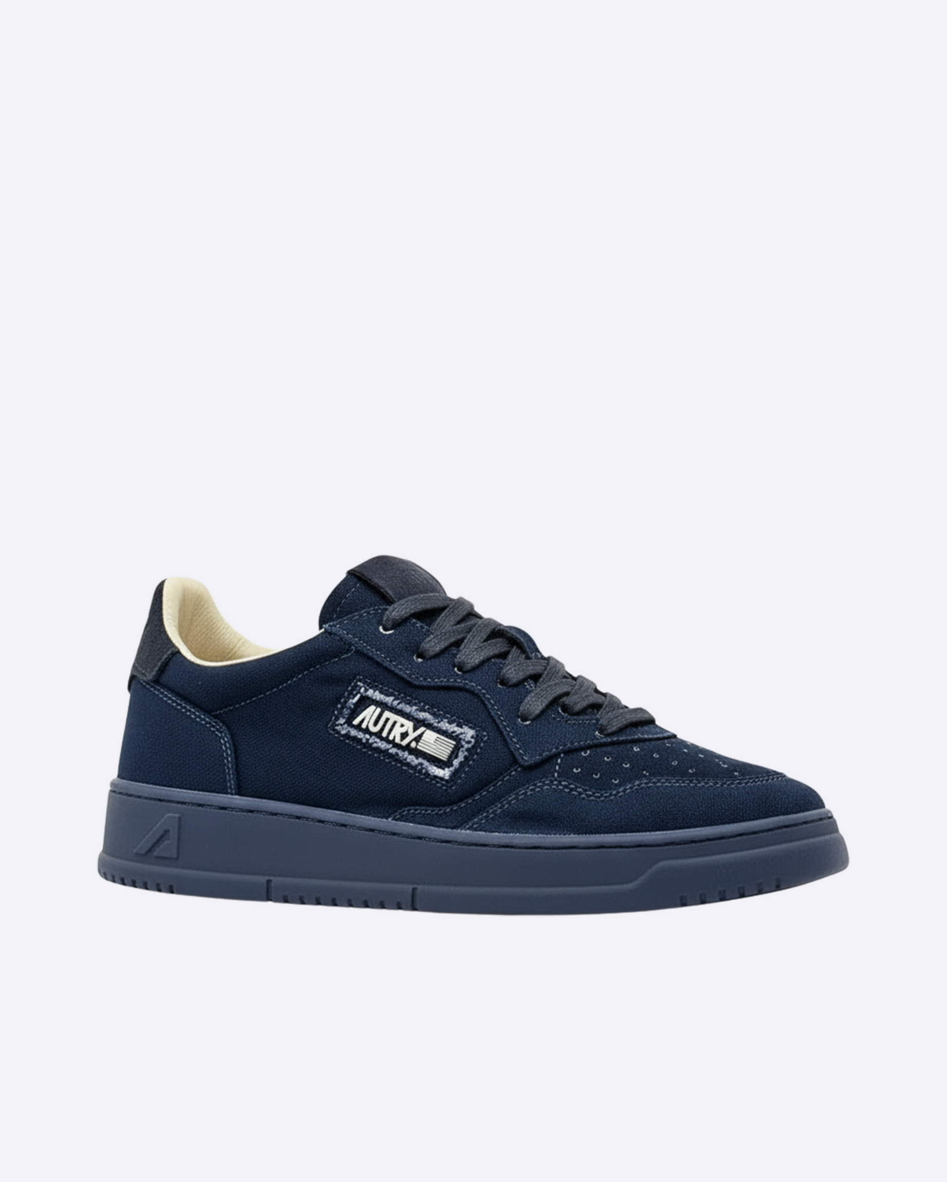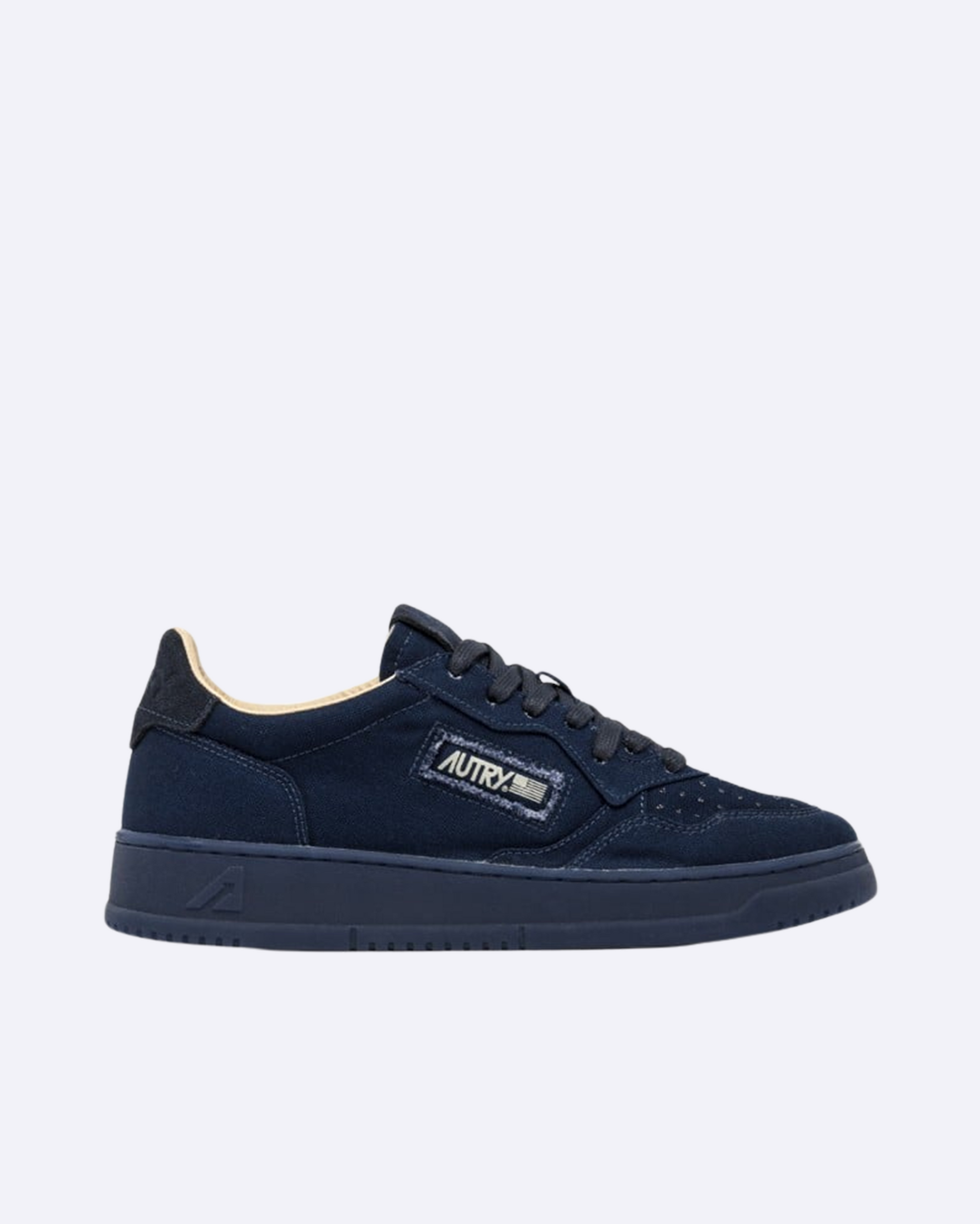 Autry Medalist con capellada de lona azul, punta microperforada y cordones planos de algodón. Detalles como etiqueta bordada en la lengeta, cuello acolchado y talón en contraste con logo lateral. Interior forrado en cuero y toalla de algodón. Suela de goma. Composición: 95% lona 10% cuero