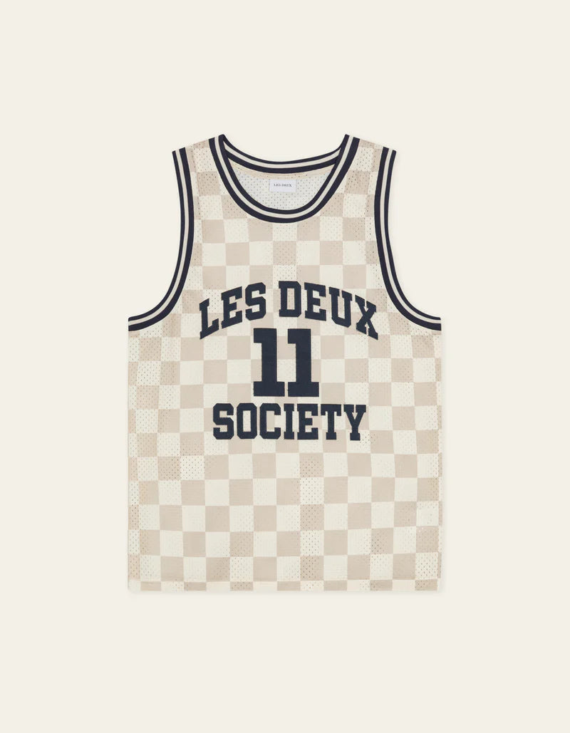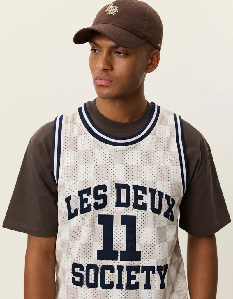 Camiseta sin mangas de malla inspirada en el baloncesto con una silueta suelta y relajada. Hecho de poliéster reciclado con ilustraciones universitarias en el pecho y encuadernación a rayas en contraste en el cuello y las sisas.